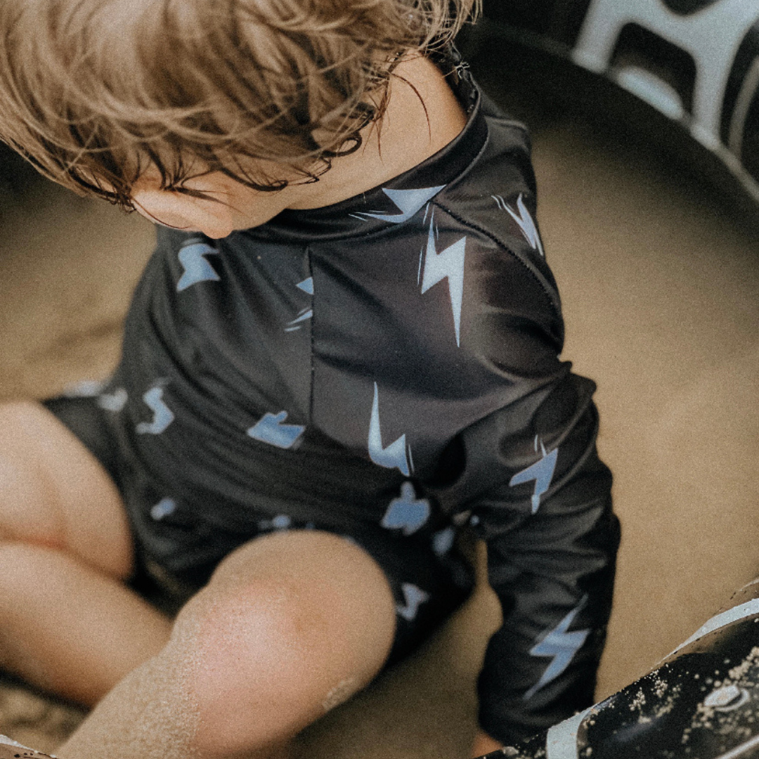 Turn heads at the pool or beach with our full-piece Lightning Bolt swimsuit! Designed for little trendsetters who love bold, playful style, this black-and-white swimsuit combines eye-catching design with ultimate comfort.